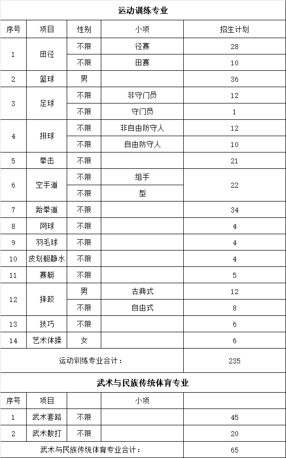 注:以上计划为拟定计划(含保送录取运动员),正式计划以上级部门下达为准。面向全国招生,不列分省计划。